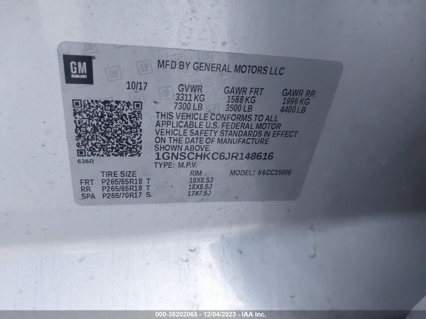About this 2018 CHEVROLET SUBURBAN C1500 LTThis 2018 CHEVROLET SUBURBAN C1500 LT is part of our AUTOMOBILE vehicles. It's VIN code is - 1GNSCHKC6JR148616. Join the auto auction to bid on this 2018 CHEVROLET SUBURBAN C1500 LT. Please note, the following damage may be present on the vehicle: UNKNOWN, which can be viewed more closely by examining the photos included on this page.As of now, the sale date is .Good luck bidding on this 2018 CHEVROLET SUBURBAN C1500 LT!