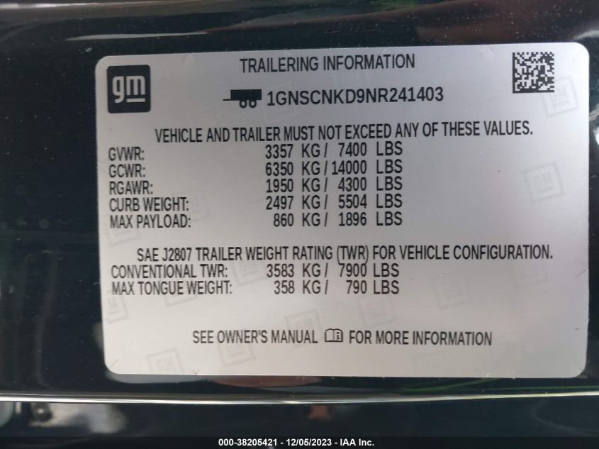 About this 2022 CHEVROLET TAHOE C1500 LTThis 2022 CHEVROLET TAHOE C1500 LT is part of our AUTOMOBILE vehicles. It's VIN code is - 1GNSCNKD9NR241403. Join the auto auction to bid on this 2022 CHEVROLET TAHOE C1500 LT. Please note, the following damage may be present on the vehicle: UNKNOWN, which can be viewed more closely by examining the photos included on this page.As of now, the sale date is .Good luck bidding on this 2022 CHEVROLET TAHOE C1500 LT!