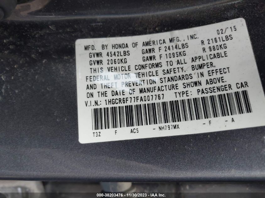 About this 2015 HONDA ACCORD HYBRID TOURINGThis 2015 HONDA ACCORD HYBRID TOURING is part of our AUTOMOBILE vehicles. It's VIN code is - 1HGCR6F77FA007767. Join the auto auction to bid on this 2015 HONDA ACCORD HYBRID TOURING. Please note, the following damage may be present on the vehicle: FRONT END and Unknown, which can be viewed more closely by examining the photos included on this page.As of now, the sale date is 27.12.2023 14:30.Good luck bidding on this 2015 HONDA ACCORD HYBRID TOURING!