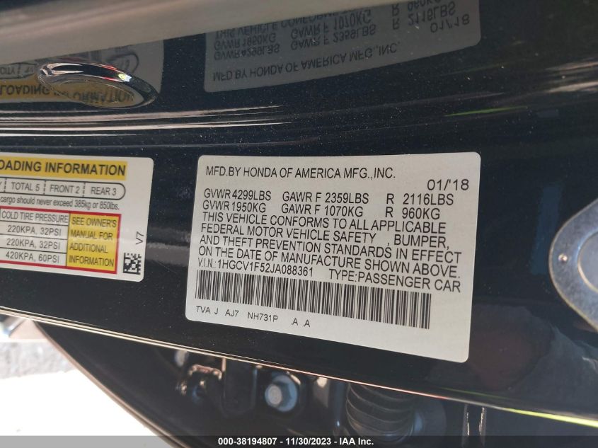 About this 2018 HONDA ACCORD EX-LThis 2018 HONDA ACCORD EX-L is part of our AUTOMOBILE vehicles. It's VIN code is - 1HGCV1F52JA088361. Join the auto auction to bid on this 2018 HONDA ACCORD EX-L. Please note, the following damage may be present on the vehicle: LEFT FRONT and Left Side, which can be viewed more closely by examining the photos included on this page.As of now, the sale date is .Good luck bidding on this 2018 HONDA ACCORD EX-L!