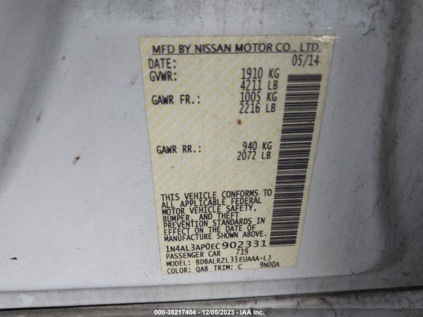 About this 2014 NISSAN ALTIMA 2.5 SThis 2014 NISSAN ALTIMA 2.5 S is part of our AUTOMOBILE vehicles. It's VIN code is - 1N4AL3AP0EC902331. Join the auto auction to bid on this 2014 NISSAN ALTIMA 2.5 S. Please note, the following damage may be present on the vehicle: FRONT END and Left Front, which can be viewed more closely by examining the photos included on this page.As of now, the sale date is 29.01.2024 14:30.Good luck bidding on this 2014 NISSAN ALTIMA 2.5 S!