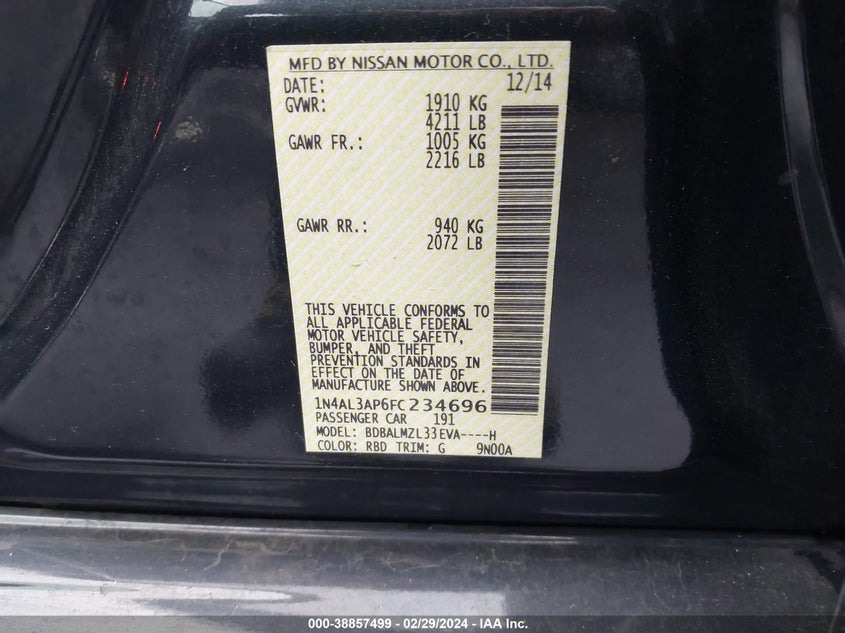 About this 2015 NISSAN ALTIMA 2.5 SVThis 2015 NISSAN ALTIMA 2.5 SV is part of our AUTOMOBILE vehicles. It's VIN code is - 1N4AL3AP6FC234696. Join the auto auction to bid on this 2015 NISSAN ALTIMA 2.5 SV. Please note, the following damage may be present on the vehicle: REAR and Left Side, which can be viewed more closely by examining the photos included on this page.As of now, the sale date is .Good luck bidding on this 2015 NISSAN ALTIMA 2.5 SV!