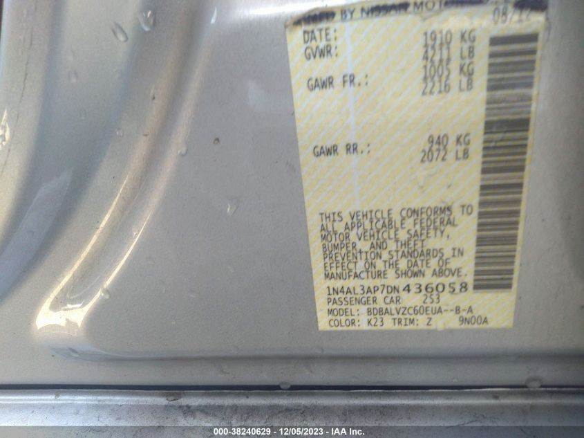 About this 2013 NISSAN ALTIMA 2.5 SLThis 2013 NISSAN ALTIMA 2.5 SL is part of our AUTOMOBILE vehicles. It's VIN code is - 1N4AL3AP7DN436058. Join the auto auction to bid on this 2013 NISSAN ALTIMA 2.5 SL. Please note, the following damage may be present on the vehicle: UNKNOWN, which can be viewed more closely by examining the photos included on this page.As of now, the sale date is .Good luck bidding on this 2013 NISSAN ALTIMA 2.5 SL!