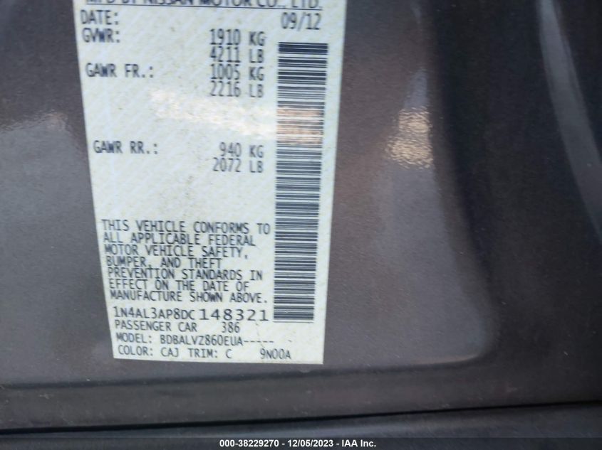 About this 2013 NISSAN ALTIMA 2.5 SLThis 2013 NISSAN ALTIMA 2.5 SL is part of our AUTOMOBILE vehicles. It's VIN code is - 1N4AL3AP8DC148321. Join the auto auction to bid on this 2013 NISSAN ALTIMA 2.5 SL. Please note, the following damage may be present on the vehicle: REAR, which can be viewed more closely by examining the photos included on this page.As of now, the sale date is 19.01.2024 14:30.Good luck bidding on this 2013 NISSAN ALTIMA 2.5 SL!