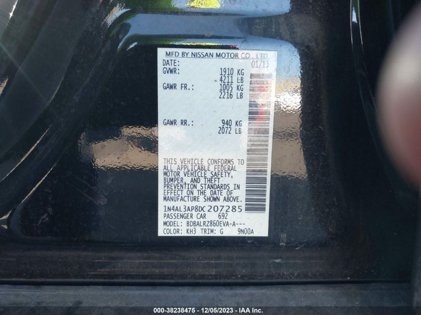 About this 2013 NISSAN ALTIMA 2.5/S/SV/SLThis 2013 NISSAN ALTIMA 2.5/S/SV/SL is part of our AUTOMOBILE vehicles. It's VIN code is - 1N4AL3AP8DC207285. Join the auto auction to bid on this 2013 NISSAN ALTIMA 2.5/S/SV/SL. Please note, the following damage may be present on the vehicle: UNKNOWN, which can be viewed more closely by examining the photos included on this page.As of now, the sale date is .Good luck bidding on this 2013 NISSAN ALTIMA 2.5/S/SV/SL!