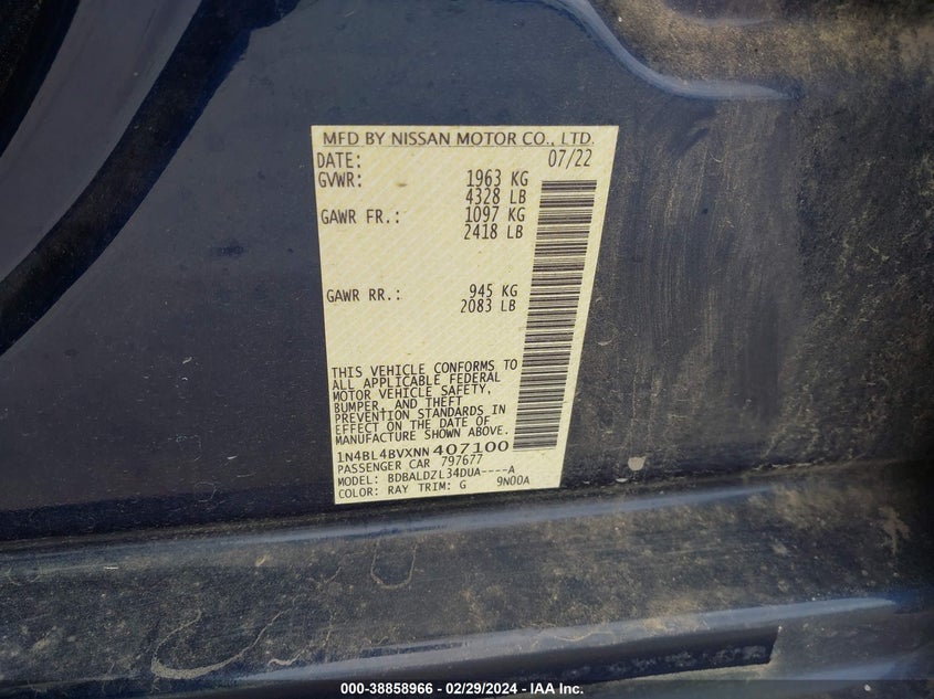 About this 2022 NISSAN ALTIMA S FWDThis 2022 NISSAN ALTIMA S FWD is part of our AUTOMOBILE vehicles. It's VIN code is - 1N4BL4BVXNN407100. Join the auto auction to bid on this 2022 NISSAN ALTIMA S FWD. Please note, the following damage may be present on the vehicle: FRONT END, which can be viewed more closely by examining the photos included on this page.As of now, the sale date is 31.05.2024 14:30.Good luck bidding on this 2022 NISSAN ALTIMA S FWD!
