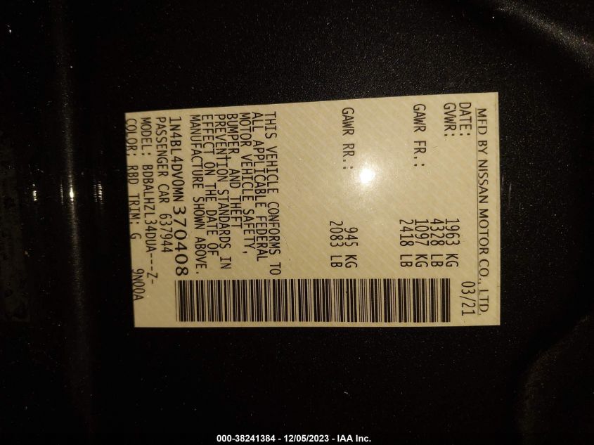 About this 2021 NISSAN ALTIMA SVThis 2021 NISSAN ALTIMA SV is part of our AUTOMOBILE vehicles. It's VIN code is - 1N4BL4DV0MN370408. Join the auto auction to bid on this 2021 NISSAN ALTIMA SV. Please note, the following damage may be present on the vehicle: UNKNOWN, which can be viewed more closely by examining the photos included on this page.As of now, the sale date is .Good luck bidding on this 2021 NISSAN ALTIMA SV!