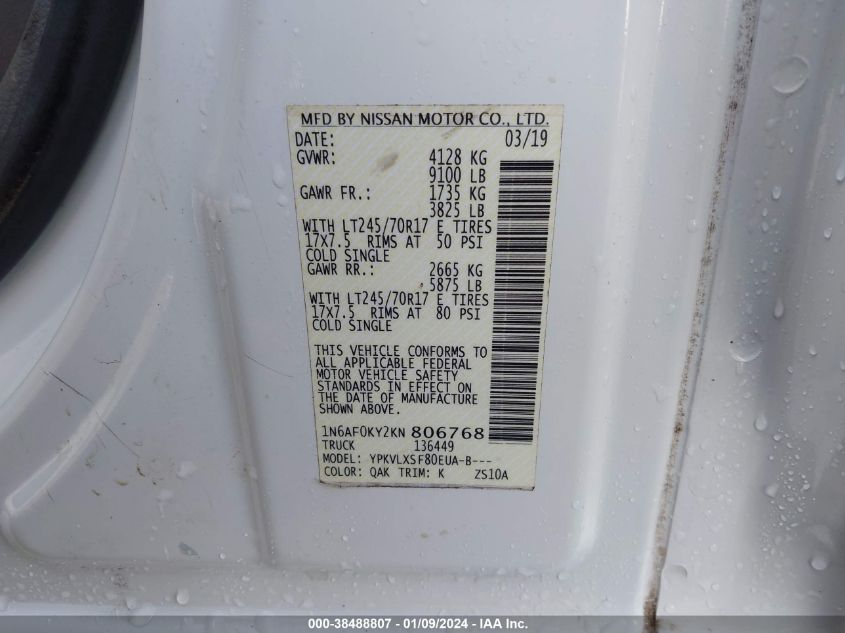 About this 2019 NISSAN NV CARGO NV2500 HD SV V8This 2019 NISSAN NV CARGO NV2500 HD SV V8 is part of our AUTOMOBILE vehicles. It's VIN code is - 1N6AF0KY2KN806768. Join the auto auction to bid on this 2019 NISSAN NV CARGO NV2500 HD SV V8. Please note, the following damage may be present on the vehicle: FRONT END and Repossession, which can be viewed more closely by examining the photos included on this page.As of now, the sale date is .Good luck bidding on this 2019 NISSAN NV CARGO NV2500 HD SV V8!