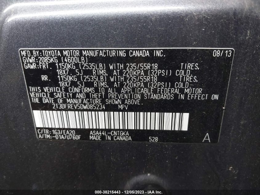 About this 2013 TOYOTA RAV4 LIMITEDThis 2013 TOYOTA RAV4 LIMITED is part of our AUTOMOBILE vehicles. It's VIN code is - 2T3DFREV5DW085234. Join the auto auction to bid on this 2013 TOYOTA RAV4 LIMITED. Please note, the following damage may be present on the vehicle: LEFT FRONT and Suspension, which can be viewed more closely by examining the photos included on this page.As of now, the sale date is 26.12.2023 14:30.Good luck bidding on this 2013 TOYOTA RAV4 LIMITED!