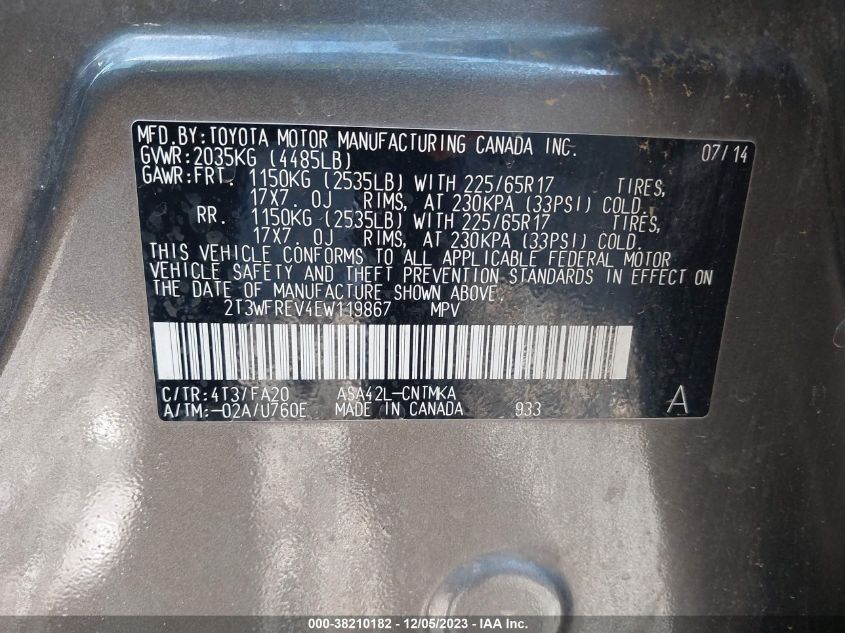 About this 2014 TOYOTA RAV4 XLEThis 2014 TOYOTA RAV4 XLE is part of our AUTOMOBILE vehicles. It's VIN code is - 2T3WFREV4EW119867. Join the auto auction to bid on this 2014 TOYOTA RAV4 XLE. Please note, the following damage may be present on the vehicle: UNKNOWN, which can be viewed more closely by examining the photos included on this page.As of now, the sale date is .Good luck bidding on this 2014 TOYOTA RAV4 XLE!
