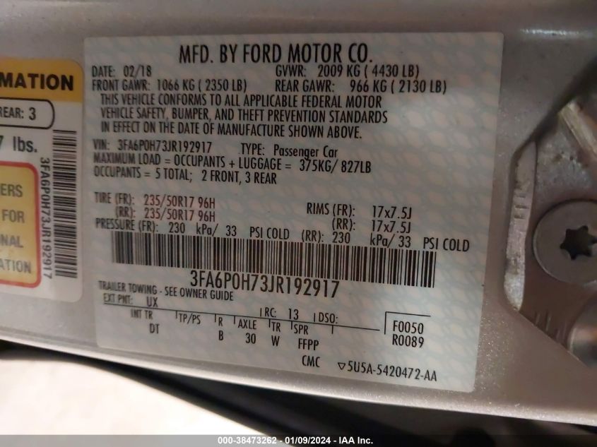 About this 2018 FORD FUSION SEThis 2018 FORD FUSION SE is part of our AUTOMOBILE vehicles. It's VIN code is - 3FA6P0H73JR192917. Join the auto auction to bid on this 2018 FORD FUSION SE. Please note, the following damage may be present on the vehicle: FRONT END and Left & Right Side, which can be viewed more closely by examining the photos included on this page.As of now, the sale date is 23.01.2024 14:30.Good luck bidding on this 2018 FORD FUSION SE!