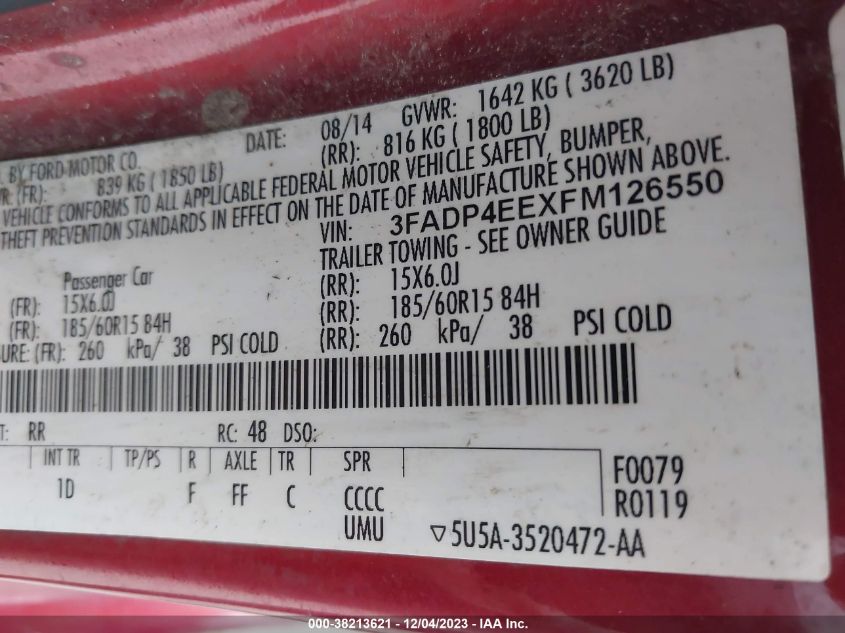 About this 2015 FORD FIESTA SEThis 2015 FORD FIESTA SE is part of our AUTOMOBILE vehicles. It's VIN code is - 3FADP4EEXFM126550. Join the auto auction to bid on this 2015 FORD FIESTA SE. Please note, the following damage may be present on the vehicle: UNKNOWN, which can be viewed more closely by examining the photos included on this page.As of now, the sale date is .Good luck bidding on this 2015 FORD FIESTA SE!