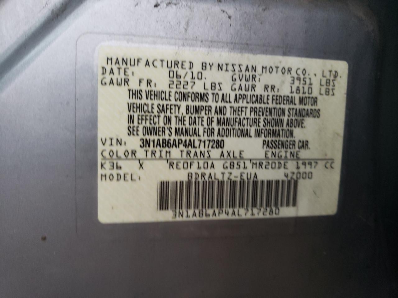 About this 2010 NISSAN SENTRA 2.0This 2010 NISSAN SENTRA 2.0 is part of our AUTOMOBILE vehicles. It's VIN code is - 3N1AB6AP4AL717280. Join the auto auction to bid on this 2010 NISSAN SENTRA 2.0. Please note, the following damage may be present on the vehicle: ALL OVER, which can be viewed more closely by examining the photos included on this page.As of now, the sale date is 02.01.2024 18:00.Good luck bidding on this 2010 NISSAN SENTRA 2.0!