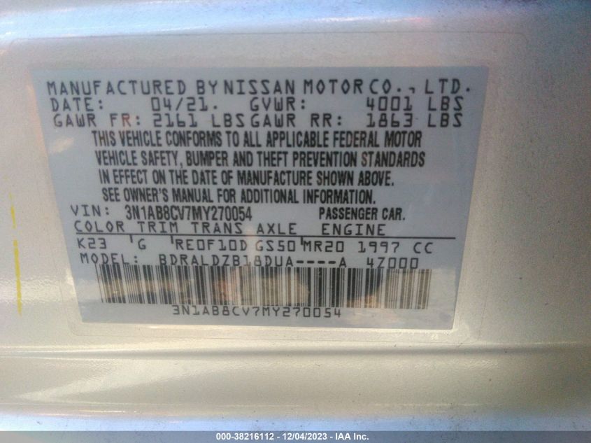 About this 2021 NISSAN SENTRA SV XTRONIC CVTThis 2021 NISSAN SENTRA SV XTRONIC CVT is part of our AUTOMOBILE vehicles. It's VIN code is - 3N1AB8CV7MY270054. Join the auto auction to bid on this 2021 NISSAN SENTRA SV XTRONIC CVT. Please note, the following damage may be present on the vehicle: RIGHT SIDE and Front & Rear, which can be viewed more closely by examining the photos included on this page.As of now, the sale date is 19.12.2023 14:30.Good luck bidding on this 2021 NISSAN SENTRA SV XTRONIC CVT!