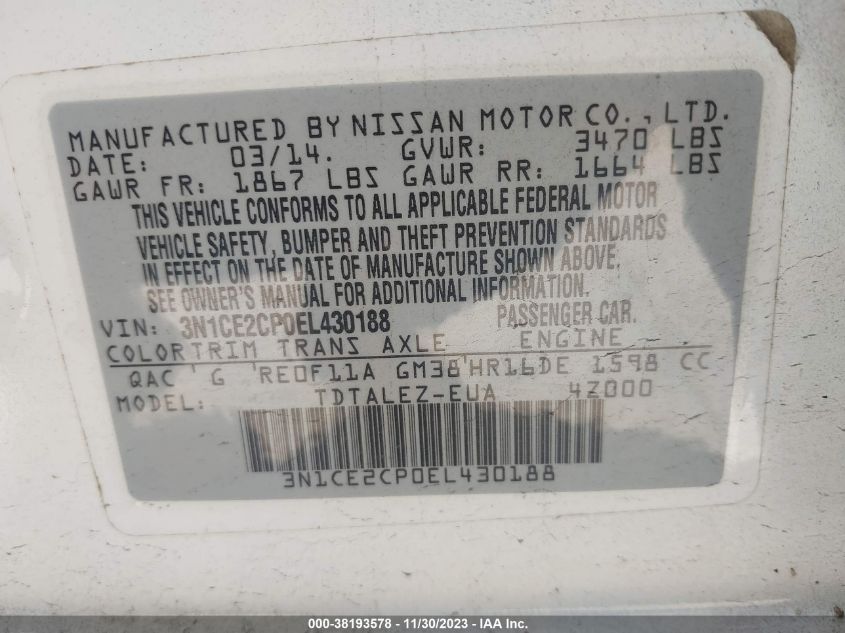 About this 2014 NISSAN VERSA NOTE SVThis 2014 NISSAN VERSA NOTE SV is part of our AUTOMOBILE vehicles. It's VIN code is - 3N1CE2CP0EL430188. Join the auto auction to bid on this 2014 NISSAN VERSA NOTE SV. Please note, the following damage may be present on the vehicle: FRONT END and Mechanical, which can be viewed more closely by examining the photos included on this page.As of now, the sale date is .Good luck bidding on this 2014 NISSAN VERSA NOTE SV!