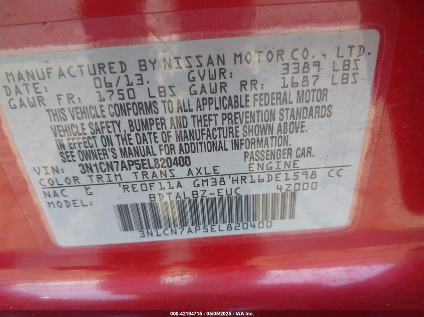 About this 2014 NISSAN VERSA 1.6 SVThis 2014 NISSAN VERSA 1.6 SV is part of our AUTOMOBILE vehicles. It's VIN code is - 3N1CN7AP5EL820400. Join the auto auction to bid on this 2014 NISSAN VERSA 1.6 SV. Please note, the following damage may be present on the vehicle: REAR, which can be viewed more closely by examining the photos included on this page.As of now, the sale date is 22.05.2025 16:30.Good luck bidding on this 2014 NISSAN VERSA 1.6 SV!