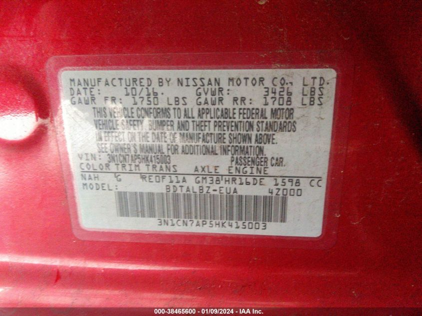 About this 2017 NISSAN VERSA S/S PLUS/SV/SLThis 2017 NISSAN VERSA S/S PLUS/SV/SL is part of our AUTOMOBILE vehicles. It's VIN code is - 3N1CN7AP5HK415003. Join the auto auction to bid on this 2017 NISSAN VERSA S/S PLUS/SV/SL. Please note, the following damage may be present on the vehicle: FRONT END, which can be viewed more closely by examining the photos included on this page.As of now, the sale date is .Good luck bidding on this 2017 NISSAN VERSA S/S PLUS/SV/SL!