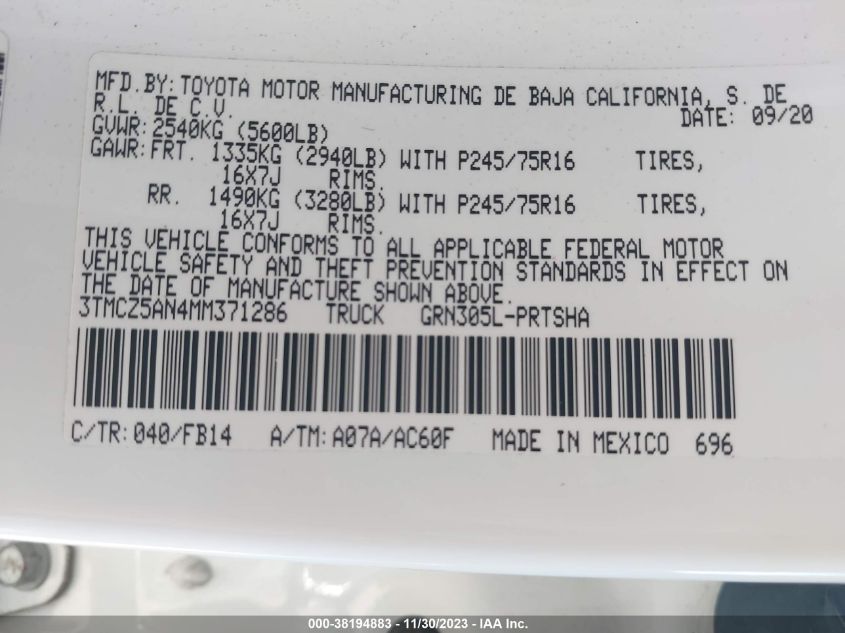 About this 2021 TOYOTA TACOMA SR V6This 2021 TOYOTA TACOMA SR V6 is part of our AUTOMOBILE vehicles. It's VIN code is - 3TMCZ5AN4MM371286. Join the auto auction to bid on this 2021 TOYOTA TACOMA SR V6. Please note, the following damage may be present on the vehicle: LEFT SIDE and Left Rear, which can be viewed more closely by examining the photos included on this page.As of now, the sale date is 26.12.2023 14:30.Good luck bidding on this 2021 TOYOTA TACOMA SR V6!