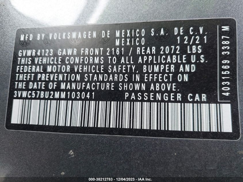 About this 2021 VOLKSWAGEN JETTA 1.4T R-LINE/1.4T S/1.4T SEThis 2021 VOLKSWAGEN JETTA 1.4T R-LINE/1.4T S/1.4T SE is part of our AUTOMOBILE vehicles. It's VIN code is - 3VWC57BU2MM103041. Join the auto auction to bid on this 2021 VOLKSWAGEN JETTA 1.4T R-LINE/1.4T S/1.4T SE. Please note, the following damage may be present on the vehicle: SUSPENSION and Rear, which can be viewed more closely by examining the photos included on this page.As of now, the sale date is 03.01.2024 17:00.Good luck bidding on this 2021 VOLKSWAGEN JETTA 1.4T R-LINE/1.4T S/1.4T SE!
