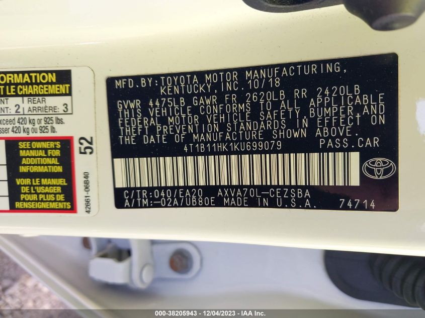 About this 2019 TOYOTA CAMRY SEThis 2019 TOYOTA CAMRY SE is part of our AUTOMOBILE vehicles. It's VIN code is - 4T1B11HK1KU699079. Join the auto auction to bid on this 2019 TOYOTA CAMRY SE. Please note, the following damage may be present on the vehicle: RIGHT FRONT and Right Rear, which can be viewed more closely by examining the photos included on this page.As of now, the sale date is .Good luck bidding on this 2019 TOYOTA CAMRY SE!