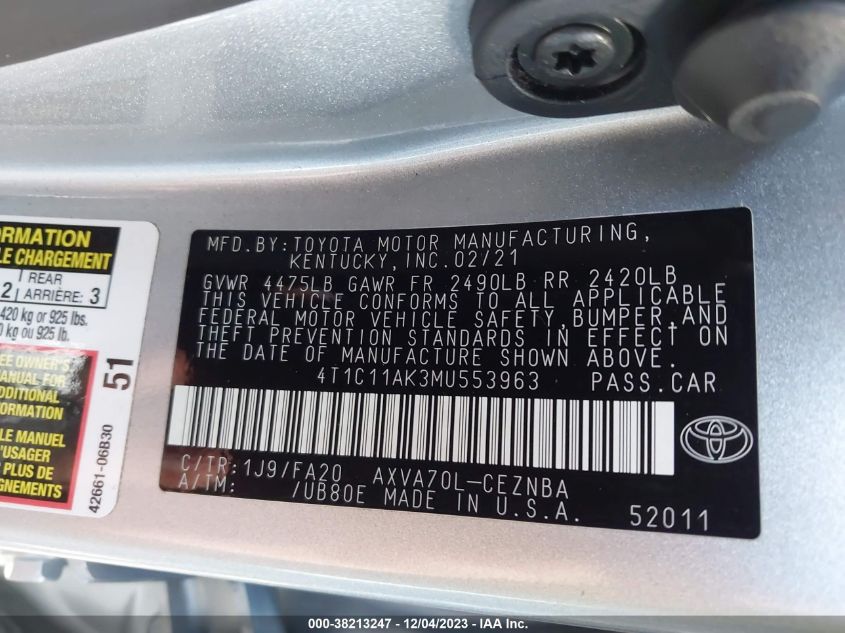 About this 2021 TOYOTA CAMRY LEThis 2021 TOYOTA CAMRY LE is part of our AUTOMOBILE vehicles. It's VIN code is - 4T1C11AK3MU553963. Join the auto auction to bid on this 2021 TOYOTA CAMRY LE. Please note, the following damage may be present on the vehicle: UNKNOWN, which can be viewed more closely by examining the photos included on this page.As of now, the sale date is .Good luck bidding on this 2021 TOYOTA CAMRY LE!