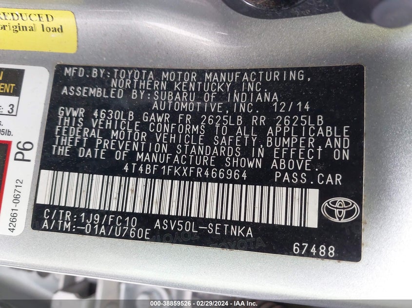 About this 2015 TOYOTA CAMRY LEThis 2015 TOYOTA CAMRY LE is part of our AUTOMOBILE vehicles. It's VIN code is - 4T4BF1FKXFR466964. Join the auto auction to bid on this 2015 TOYOTA CAMRY LE. Please note, the following damage may be present on the vehicle: FRONT END, which can be viewed more closely by examining the photos included on this page.As of now, the sale date is .Good luck bidding on this 2015 TOYOTA CAMRY LE!