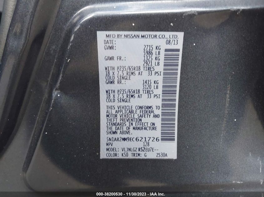 About this 2014 NISSAN PATHFINDER SLThis 2014 NISSAN PATHFINDER SL is part of our AUTOMOBILE vehicles. It's VIN code is - 5N1AR2MM9EC621726. Join the auto auction to bid on this 2014 NISSAN PATHFINDER SL. Please note, the following damage may be present on the vehicle: LEFT SIDE and Unknown, which can be viewed more closely by examining the photos included on this page.As of now, the sale date is .Good luck bidding on this 2014 NISSAN PATHFINDER SL!