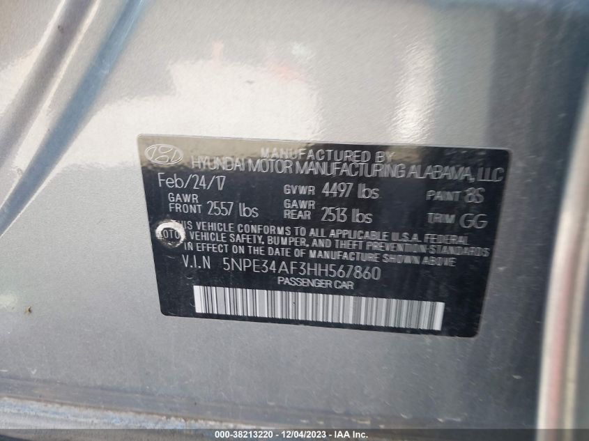 About this 2017 HYUNDAI SONATA SPORT/LIMITEDThis 2017 HYUNDAI SONATA SPORT/LIMITED is part of our AUTOMOBILE vehicles. It's VIN code is - 5NPE34AF3HH567860. Join the auto auction to bid on this 2017 HYUNDAI SONATA SPORT/LIMITED. Please note, the following damage may be present on the vehicle: FRONT END, which can be viewed more closely by examining the photos included on this page.As of now, the sale date is .Good luck bidding on this 2017 HYUNDAI SONATA SPORT/LIMITED!