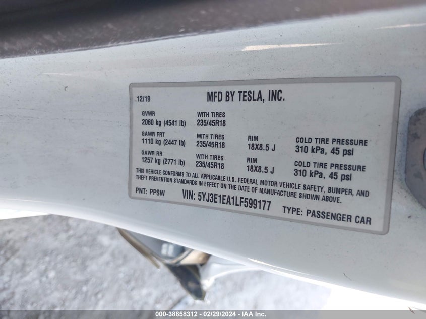 About this 2020 TESLA MODEL 3This 2020 TESLA MODEL 3 is part of our AUTOMOBILE vehicles. It's VIN code is - 5YJ3E1EA1LF599177. Join the auto auction to bid on this 2020 TESLA MODEL 3. Please note, the following damage may be present on the vehicle: LEFT SIDE and Right Rear, which can be viewed more closely by examining the photos included on this page.As of now, the sale date is 26.03.2024 13:30.Good luck bidding on this 2020 TESLA MODEL 3!