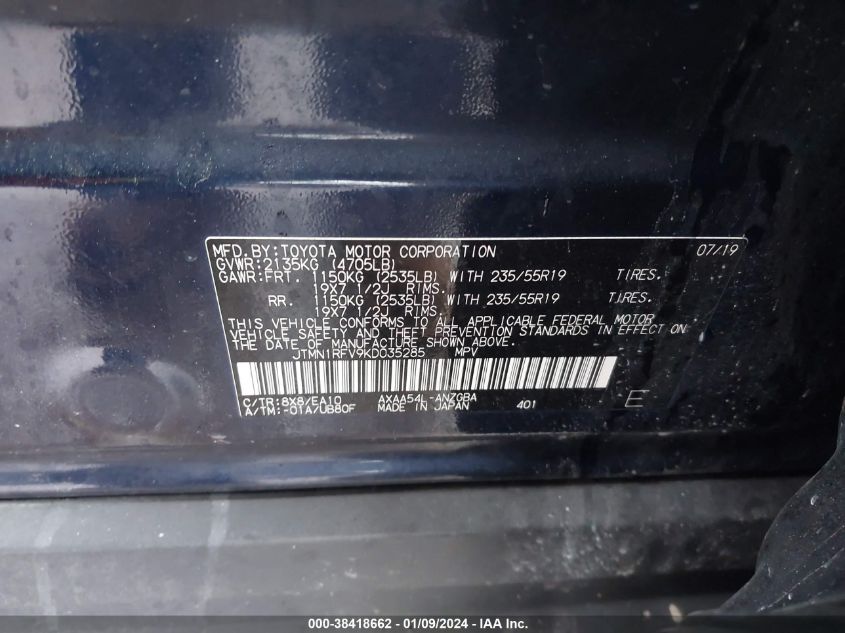 About this 2019 TOYOTA RAV4 LIMITEDThis 2019 TOYOTA RAV4 LIMITED is part of our AUTOMOBILE vehicles. It's VIN code is - JTMN1RFV9KD035285. Join the auto auction to bid on this 2019 TOYOTA RAV4 LIMITED. Please note, the following damage may be present on the vehicle: FRONT END, which can be viewed more closely by examining the photos included on this page.As of now, the sale date is .Good luck bidding on this 2019 TOYOTA RAV4 LIMITED!