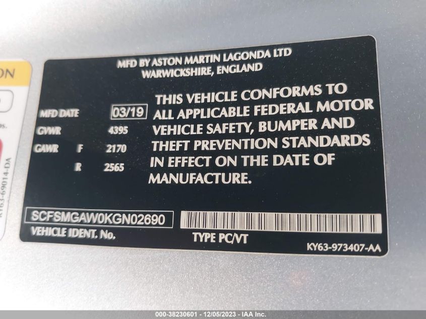 About this 2019 ASTON MARTIN VANTAGEThis 2019 ASTON MARTIN VANTAGE is part of our AUTOMOBILE vehicles. It's VIN code is - SCFSMGAW0KGN02690. Join the auto auction to bid on this 2019 ASTON MARTIN VANTAGE. Please note, the following damage may be present on the vehicle: LEFT SIDE, which can be viewed more closely by examining the photos included on this page.As of now, the sale date is 24.01.2024 17:30.Good luck bidding on this 2019 ASTON MARTIN VANTAGE!