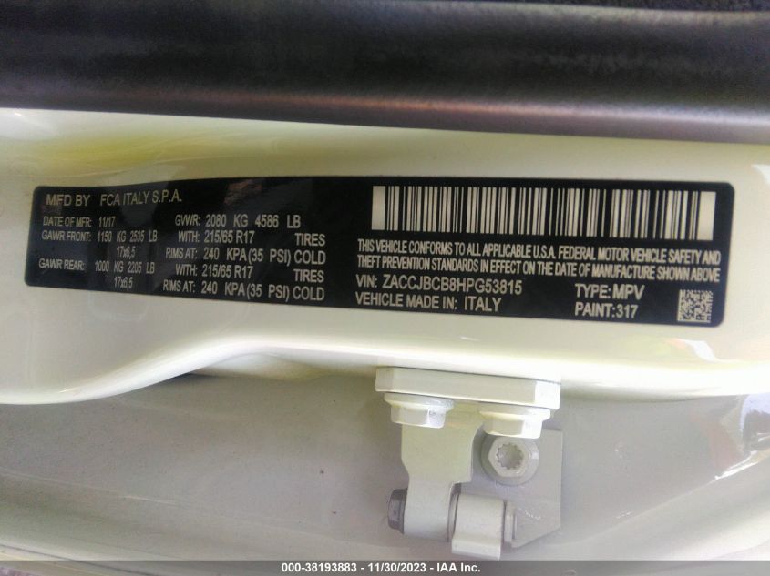About this 2017 JEEP RENEGADE TRAILHAWK 4X4This 2017 JEEP RENEGADE TRAILHAWK 4X4 is part of our AUTOMOBILE vehicles. It's VIN code is - ZACCJBCB8HPG53815. Join the auto auction to bid on this 2017 JEEP RENEGADE TRAILHAWK 4X4. Please note, the following damage may be present on the vehicle: FRONT END, which can be viewed more closely by examining the photos included on this page.As of now, the sale date is 26.12.2023 14:30.Good luck bidding on this 2017 JEEP RENEGADE TRAILHAWK 4X4!